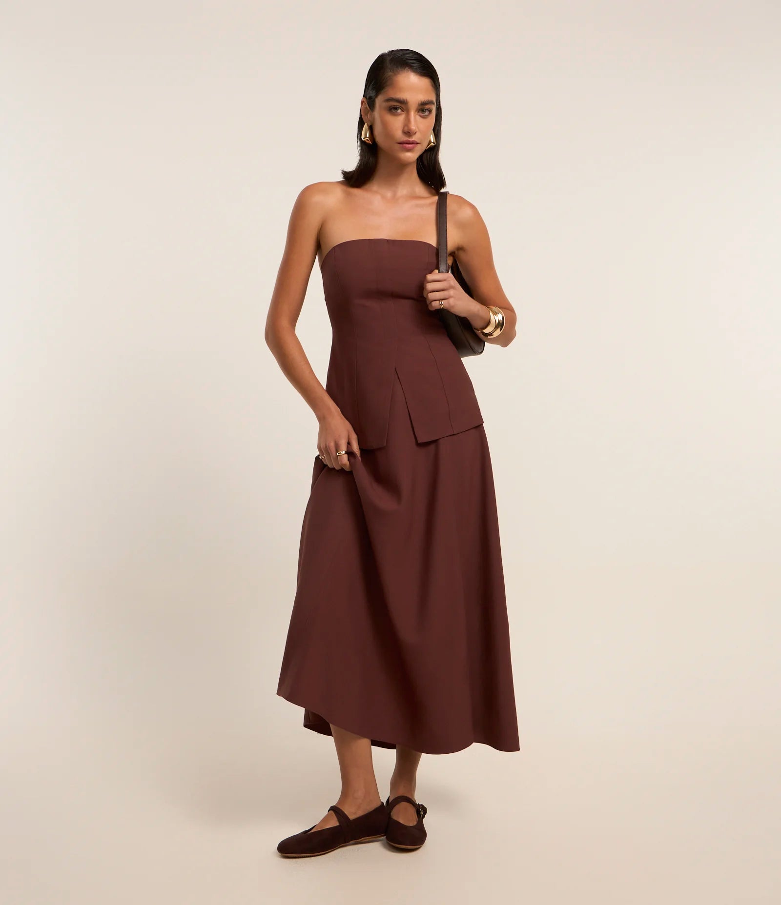 Saia Evasê Midi em Crepe com Cós Fixo Marrom