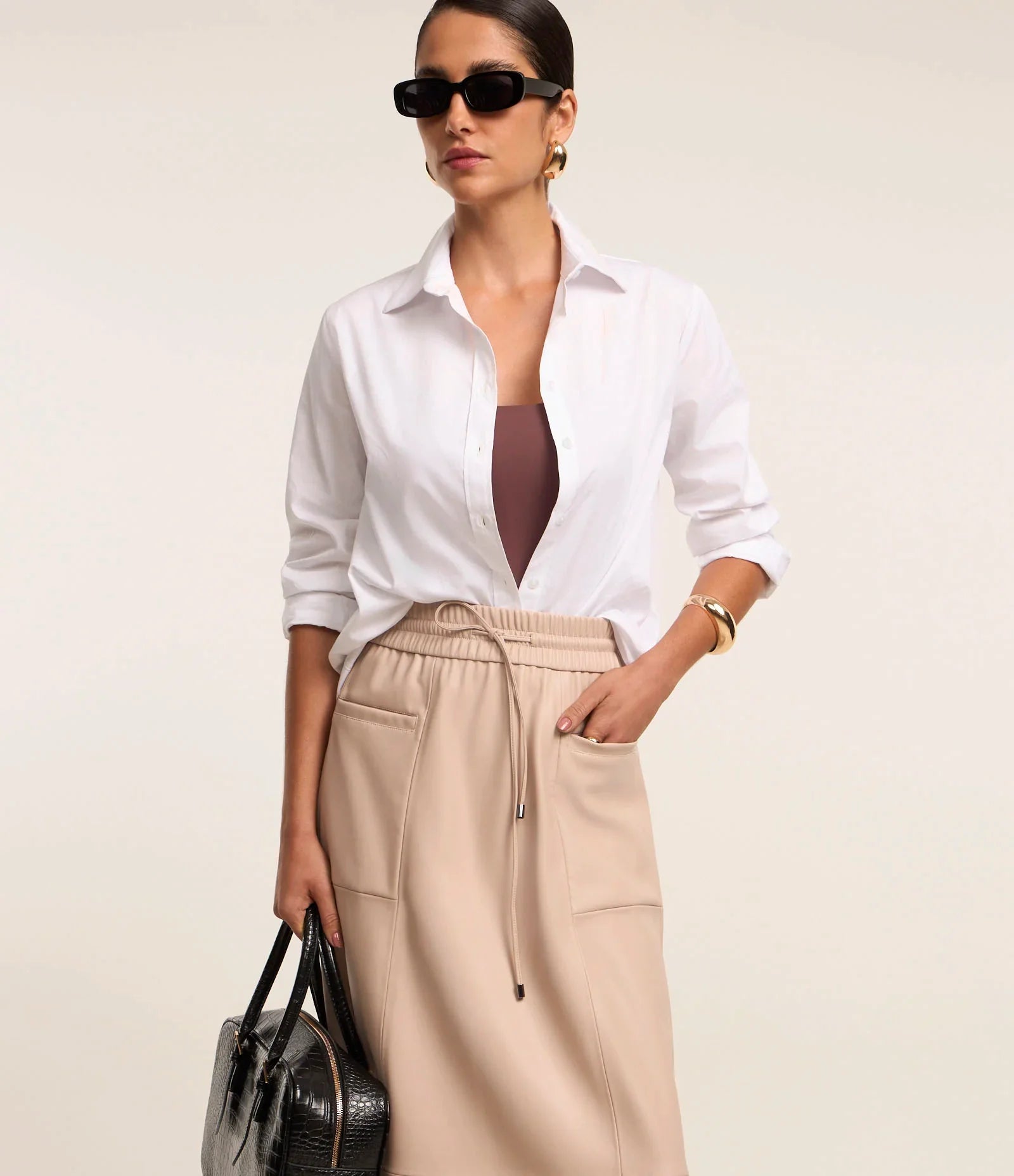 Saia Midi em Material Sintético com Cós Elástico e Bolsos Bege